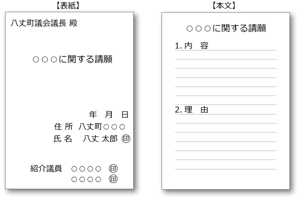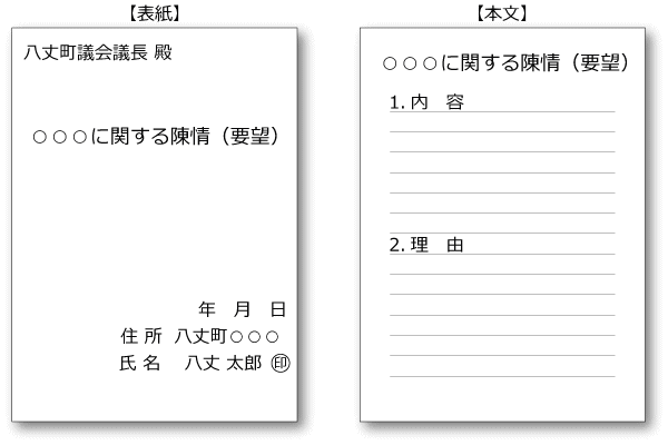 提出者は請願・陳情の要旨などを記載し、住所を明記し、署名または記名押印の上、議長宛に提出してください