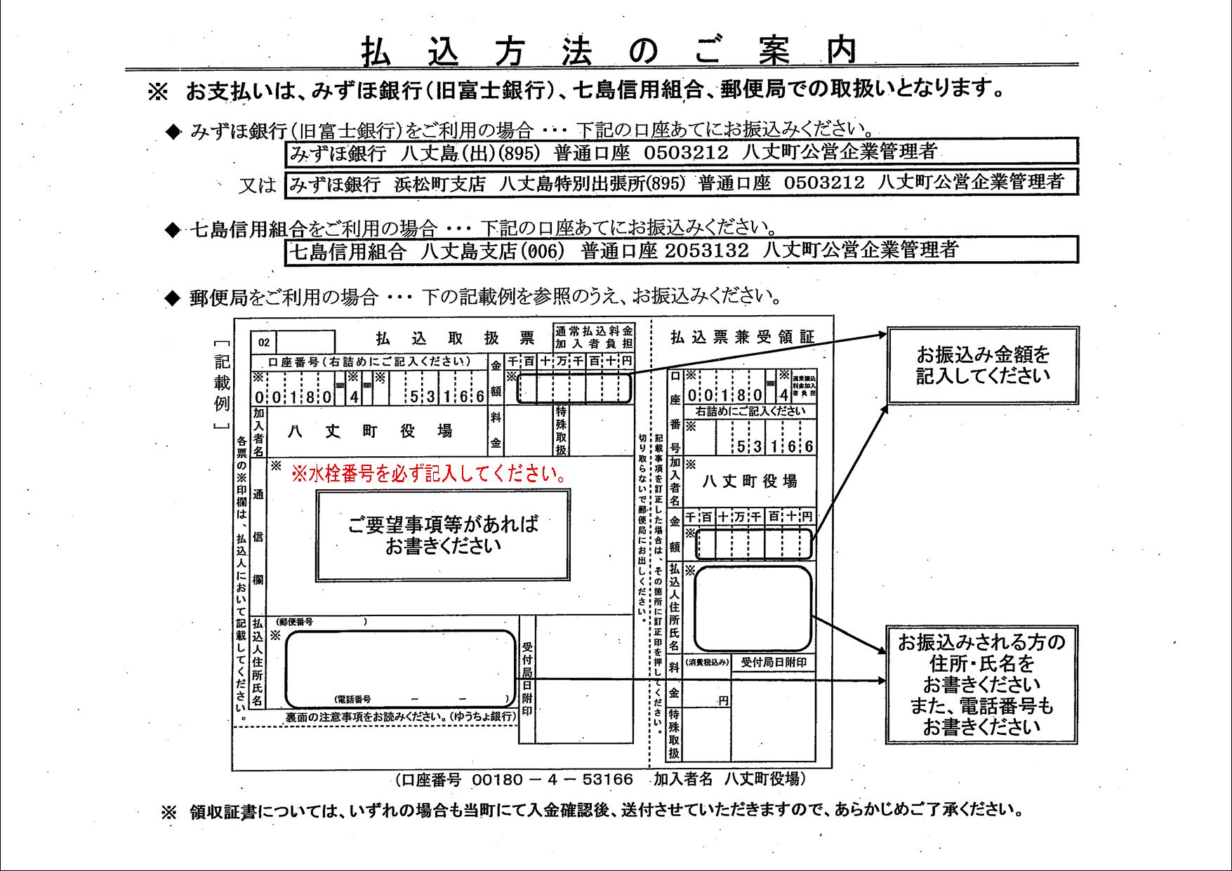 手続きは、金融機関(七島信用組合・みずほ銀行・ゆうちょ銀行)または、町役場、各出張所にある決められた用紙に記入し、金融機関でお申し込みください
