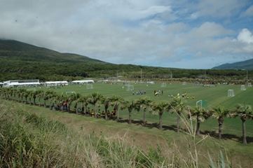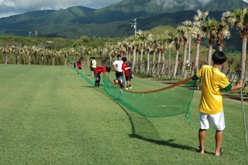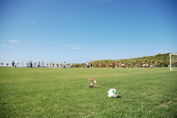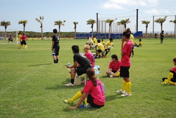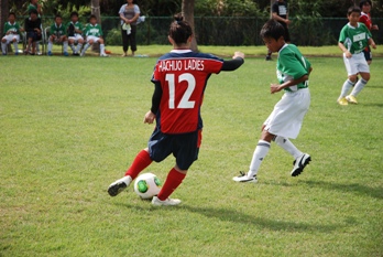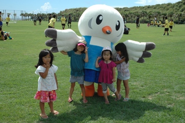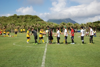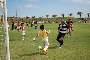 子どもチームが大人チームに負けじと必死にボールを追いかける姿、