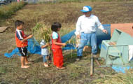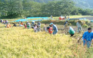 | 地域住民の田植え体験 | 順調に成長しています | 稲刈り体験 |