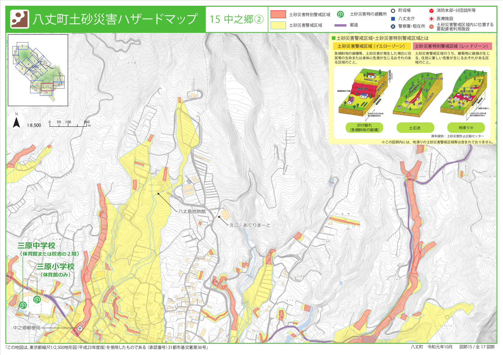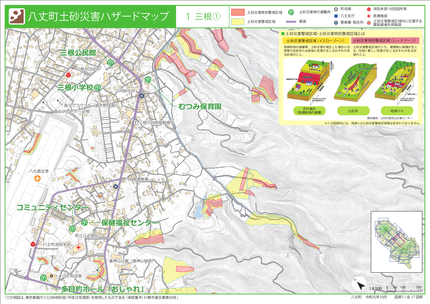 土砂災害ハザードマップは、土砂災害警戒区域等の概ねの位置を示したものです。地図面の土砂災害警戒区域等は土砂災害ハザードマップ作成時点のものであり、現在の指定状況とは異なる場合があります。最新の指定状況については、東京都土砂災害警戒区域等マップ(外部サイト)をご確認ください。