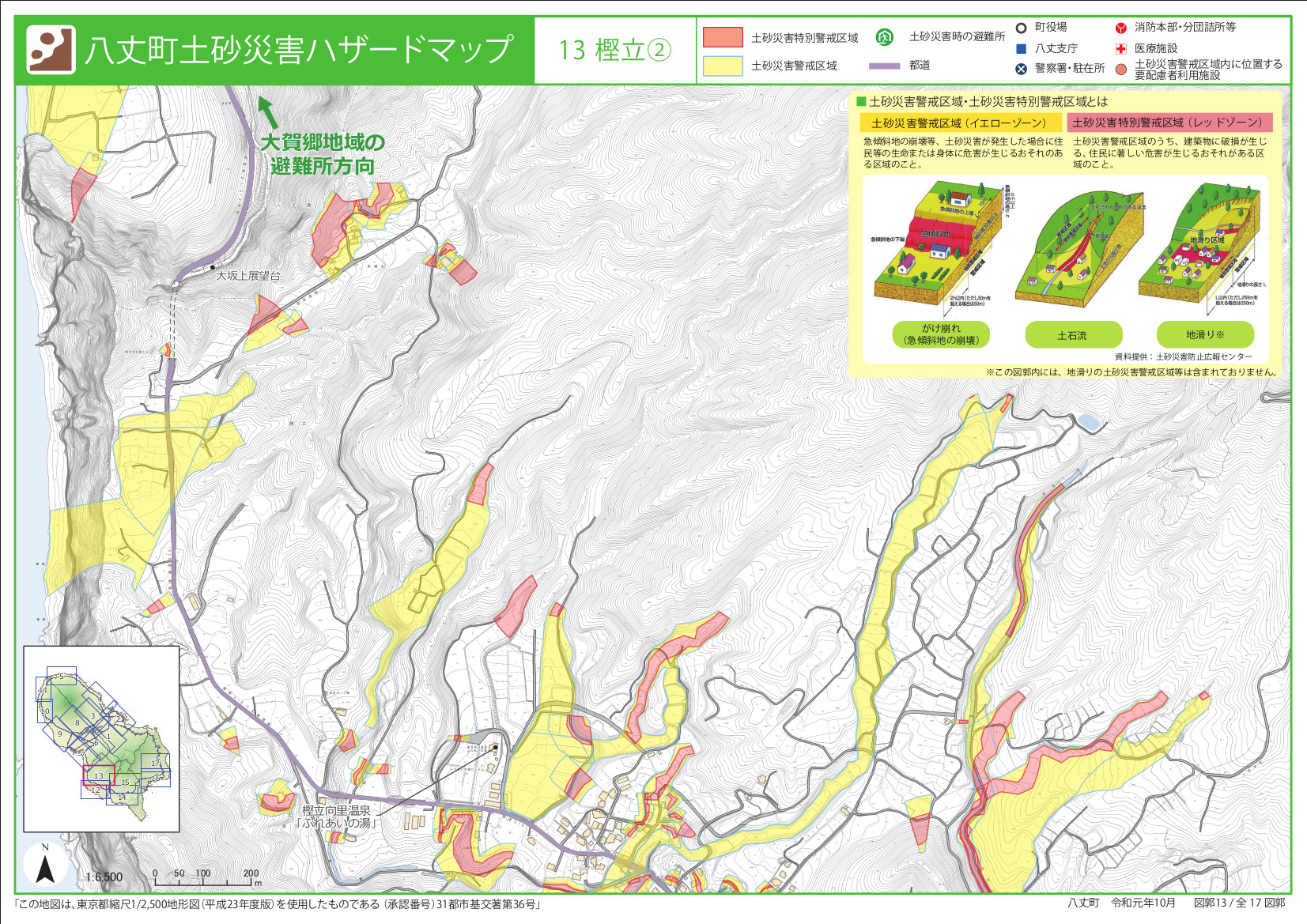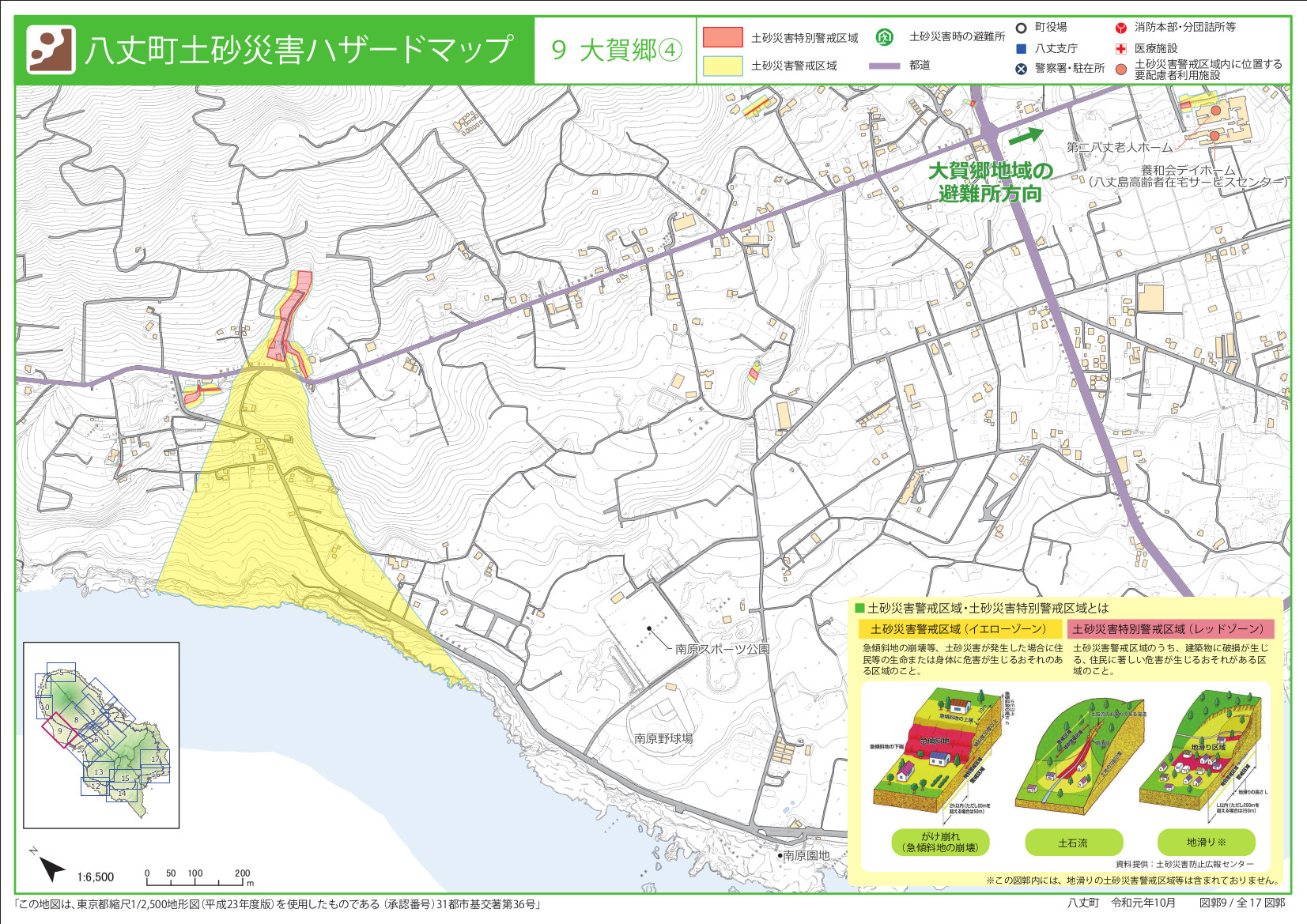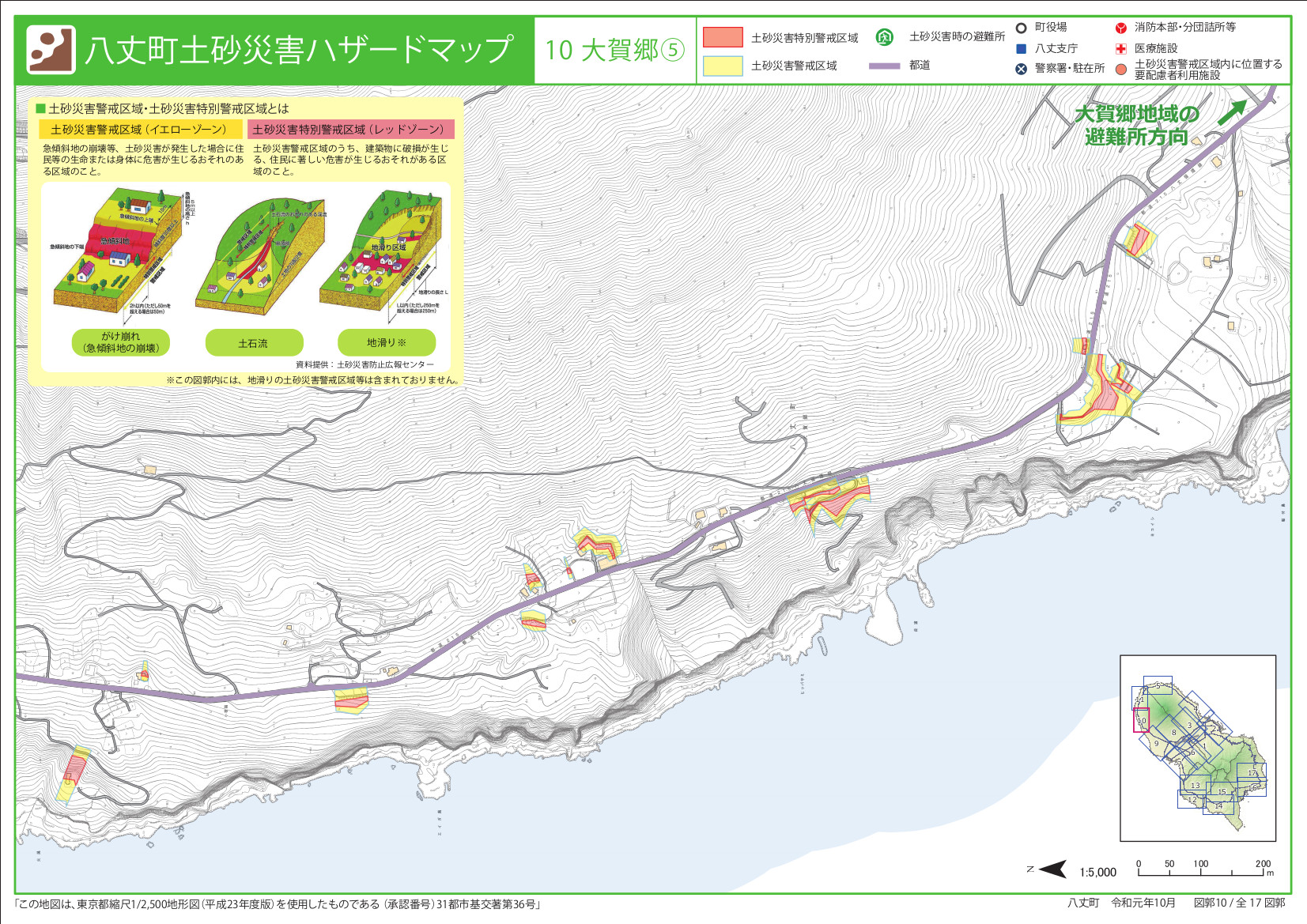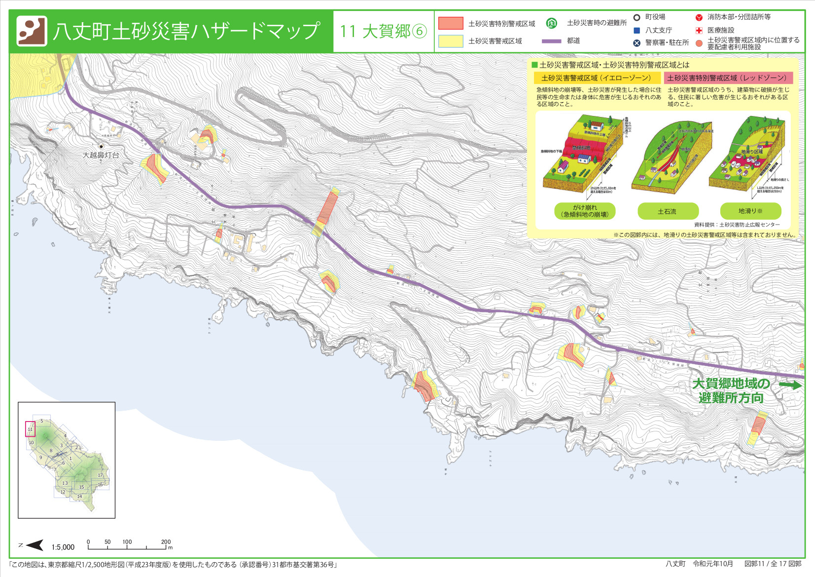台風や大雨等による地盤の変化により、土砂災害の発生が予測される場合や実際に発生した場合に、住民の皆さんが避難などの適切な行動をとっていただくために「八丈町土砂災害ハザードマップ」を作成しました。