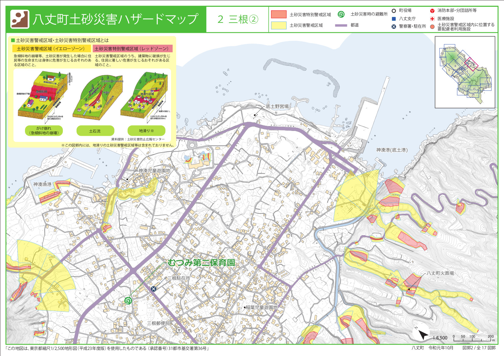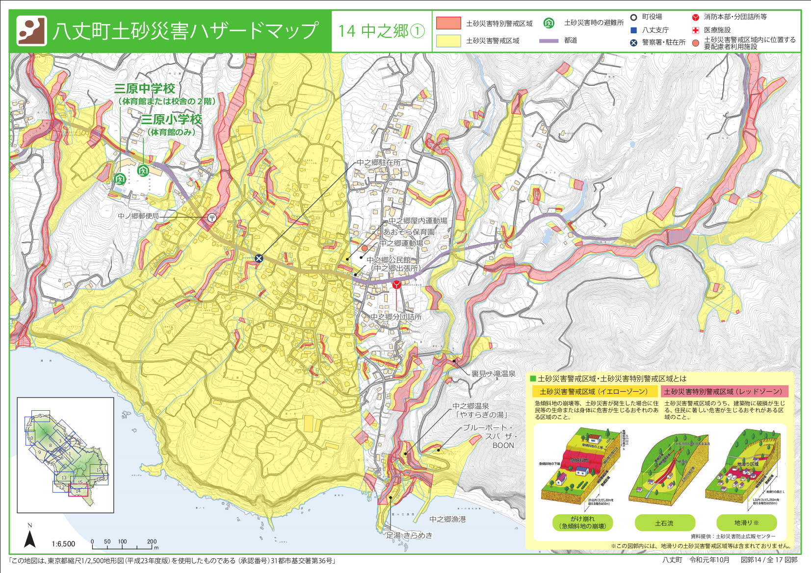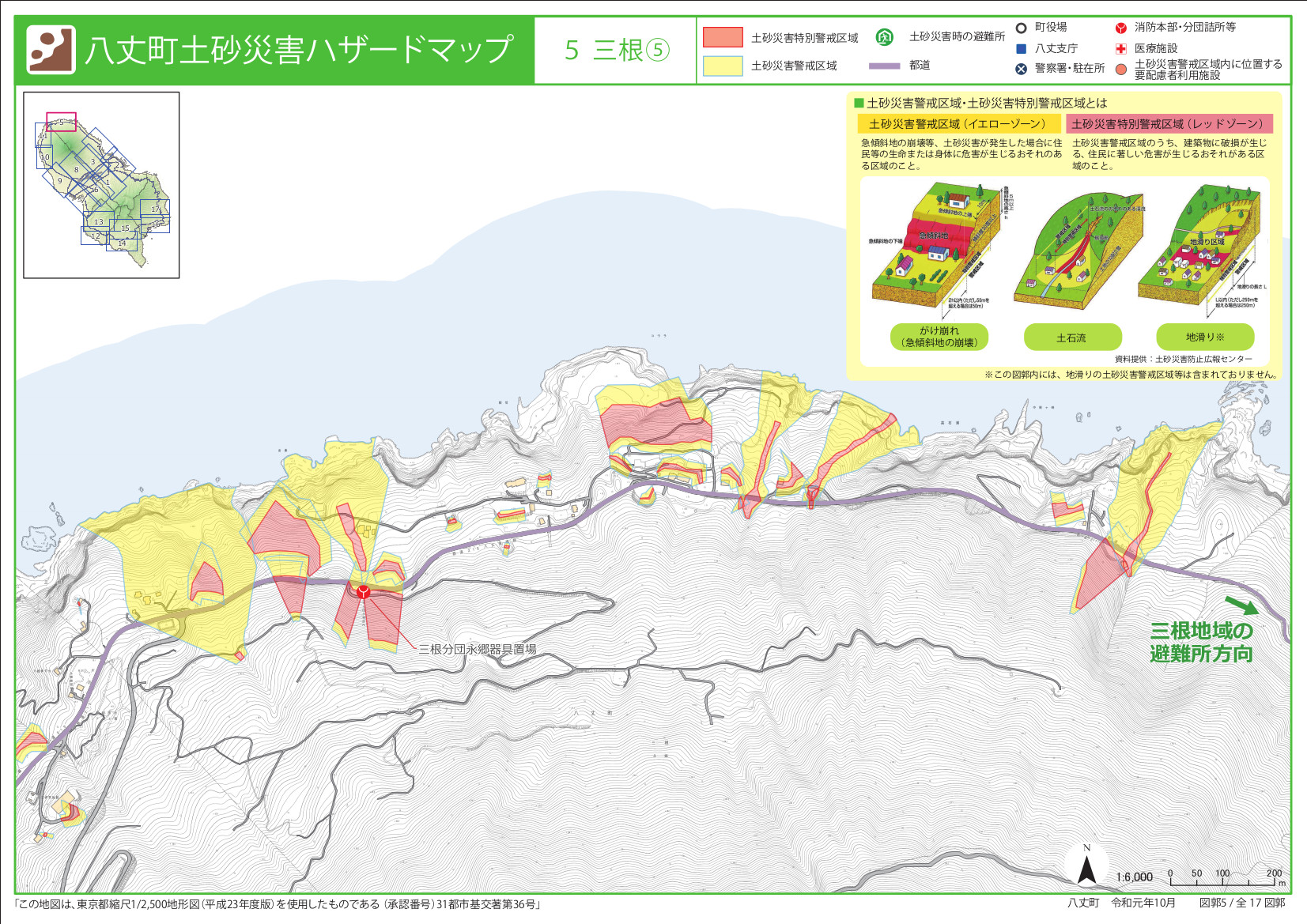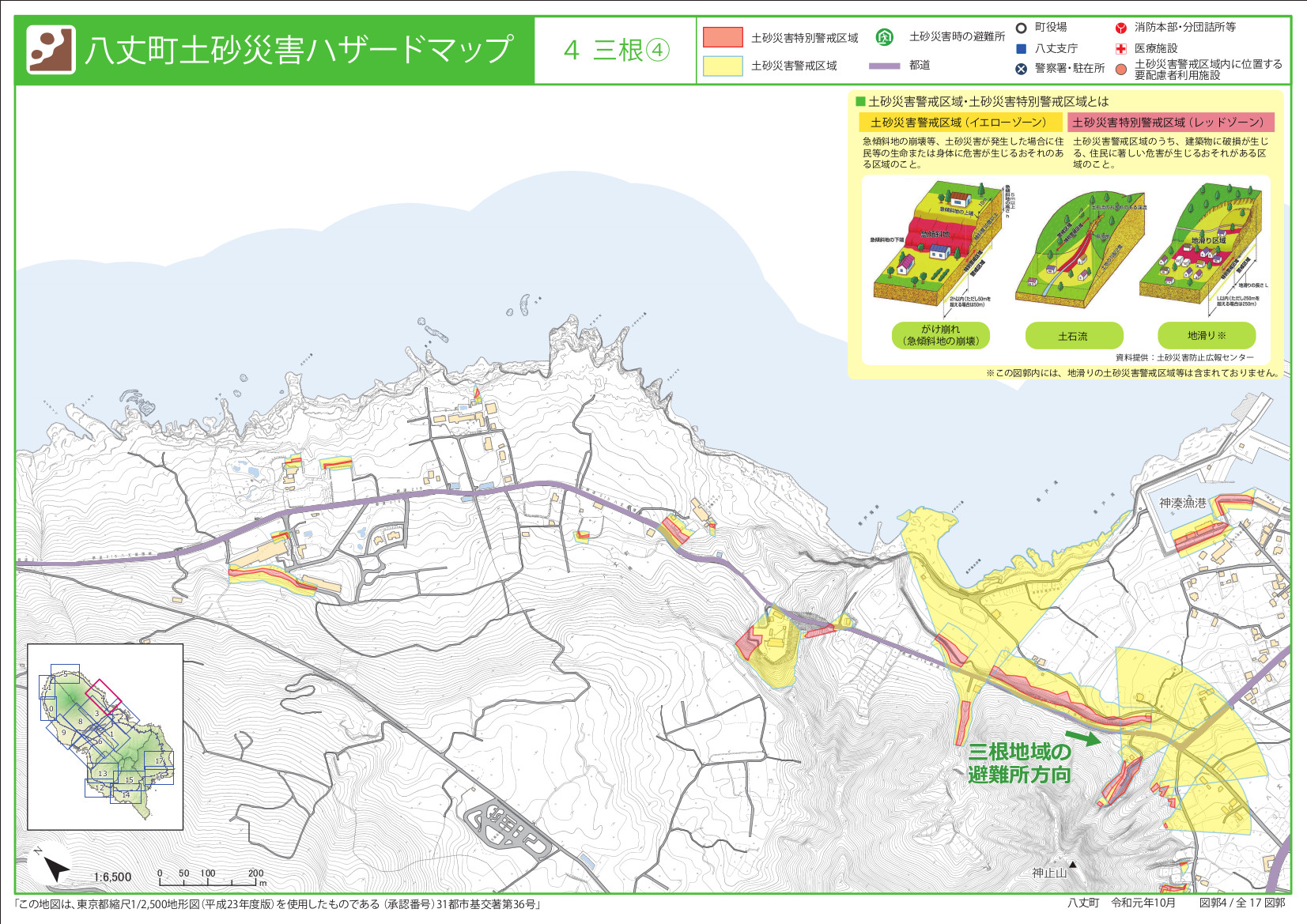台風や大雨等による地盤の変化により、土砂災害の発生が予測される場合や実際に発生した場合に、住民の皆さんが避難などの適切な行動をとっていただくために「八丈町土砂災害ハザードマップ」を作成しました。