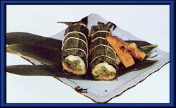 | 4 | 1にあした葉の茎と味噌を中心にして巻き、笹の葉で巻きしばる。 | ||