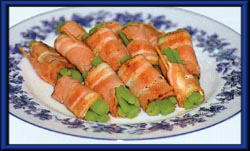 4〜5cmの長さに切ったあした葉の茎3本をベーコンで巻き、つまようじで止める。