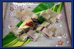 ムロを三枚におろし、塩を半身全体にふりしめて、酢(別途2カップ)に10分位つけしめる。
