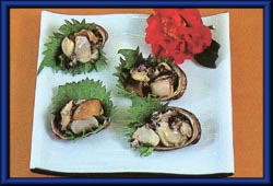 貝の中に大葉をのせ、切ったトコブシを盛る。