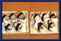 メットウは塩水で茹で、冷まして貝から抜く。よく水洗いした後、わたをはずし薄くそぎ切りにして、にぎりすしにのせ、海苔でかるくしばる。