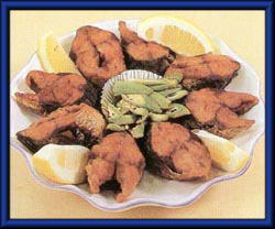 ムロアジは頭と腹ワタをとり、斜め切りにし、3〜4つに切る。