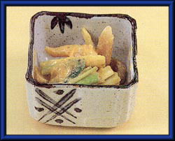 トミメは3枚におろし骨を取り除き、細切りにする。 塩、酒をふりかけしばらくおき、熱湯へさっとくぐらせ冷ます。 |