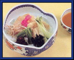 | 4 | 器に大根のせん切りを敷き、ブダイ、わけぎ、わかめを盛り3をかける。ミョウガの子、きゅうりのせん切り、紅たてを飾る。 | ||