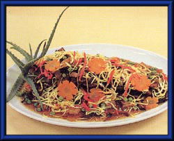 | 4 | 1の揚げたての魚に2の野菜あんをのせ、薄焼き卵、紅生姜・グリンピースを飾る。 | ||