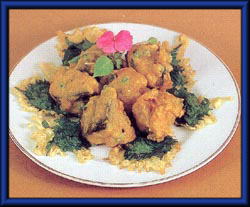 | 3 | 1の汁をきり2をつけて揚げる。青じそは裏側だけ残しておいた卵水と小麦粉を少々まぜてさっと揚げる。 | ||||